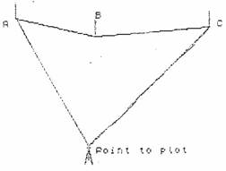 An archaeological planning utility program originally written to meet the needs of a specific site. In a difficult rescue situation such as a large working gravel pit where the weather and landscape change from day to day it is often not possible to use a conventional grid system of planning. PITCALC is an adaptation of a surveying method which overcomes such difficulties and can give very accurate results, with a minimum of 'on site' effort. A theodolite is positioned over the point to be plotted and bearings taken to fixed reference points in or around the site. Readings are written directly into the site note book. The reference points could include such objects as buildings, trees, telegraph poles or ranging poles. It will be necessary to find the exact distances between them either by measurements on site, plans or by calculation (see D overleaf) A. THREE BEARING PITCALC converts three bearings into distances from the sighted points. If the sighted points are not on a straight line there will be two possible sets of results from one set of three bearings. In order to know which set of distances applies to your case the program will stop and ask you to press Yes or No in answer to the question, “Is 'B' nearer to the point to plot than line A to C?"