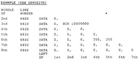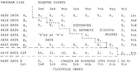 The data is stored according to the order of the sighted points rather than the actual number 1 to 9 which you can allocate in any order. Line 6680 stores the numbers which you choose in a clockwise order. Line 6670 should not be altered except for its last part which stores the distance between the 8th and 9th sighted point. The latter parts of lines 6600 to 6660 store the other SP distances as shown above. Details of the 'Yes' or 'No' data (see A) is stored in the first part of lines 6600 to 6660 and this will require further explanation. The standard PITCALC has all 'Yes' and 'No’s set to '0' which gives a 'No' answer in all cases. 255 could be inserted to 'represent 'Yes'.